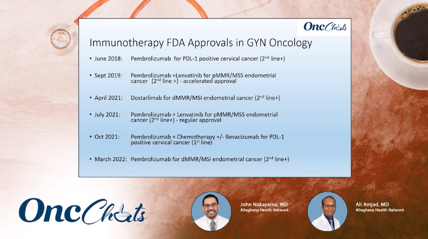 In this sixth episode of OncChats: Immunotherapy and You, John Nakayama, MD, and Ali Amjad, MD, highlight the success seen with checkpoint inhibitors in gynecologic cancers, biomarkers of interest, and recent approvals in the space.