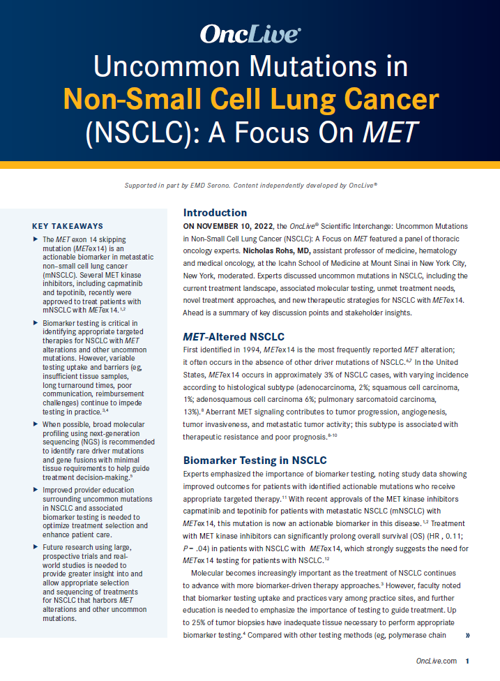 https://www.emdserono.com/us-en/pi/tepmetko-pi.pdf - Pennell NA, Arcila ME, Gandara DR, West H. Biomarker testing for patients with advanced non-small cell lung cancer: real-world issues and tough choices. Am Soc Clin Oncol Educ Book. 2019;39:531-542. doi:10.1200/EDBK_237863